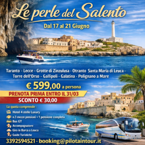 📍 Taranto – Lecce – Grotte di Zinzulusa – Otranto – Santa Maria di Leuca – Torre dell’Orso – Gallipoli – Galatina – Polignano a Mare
