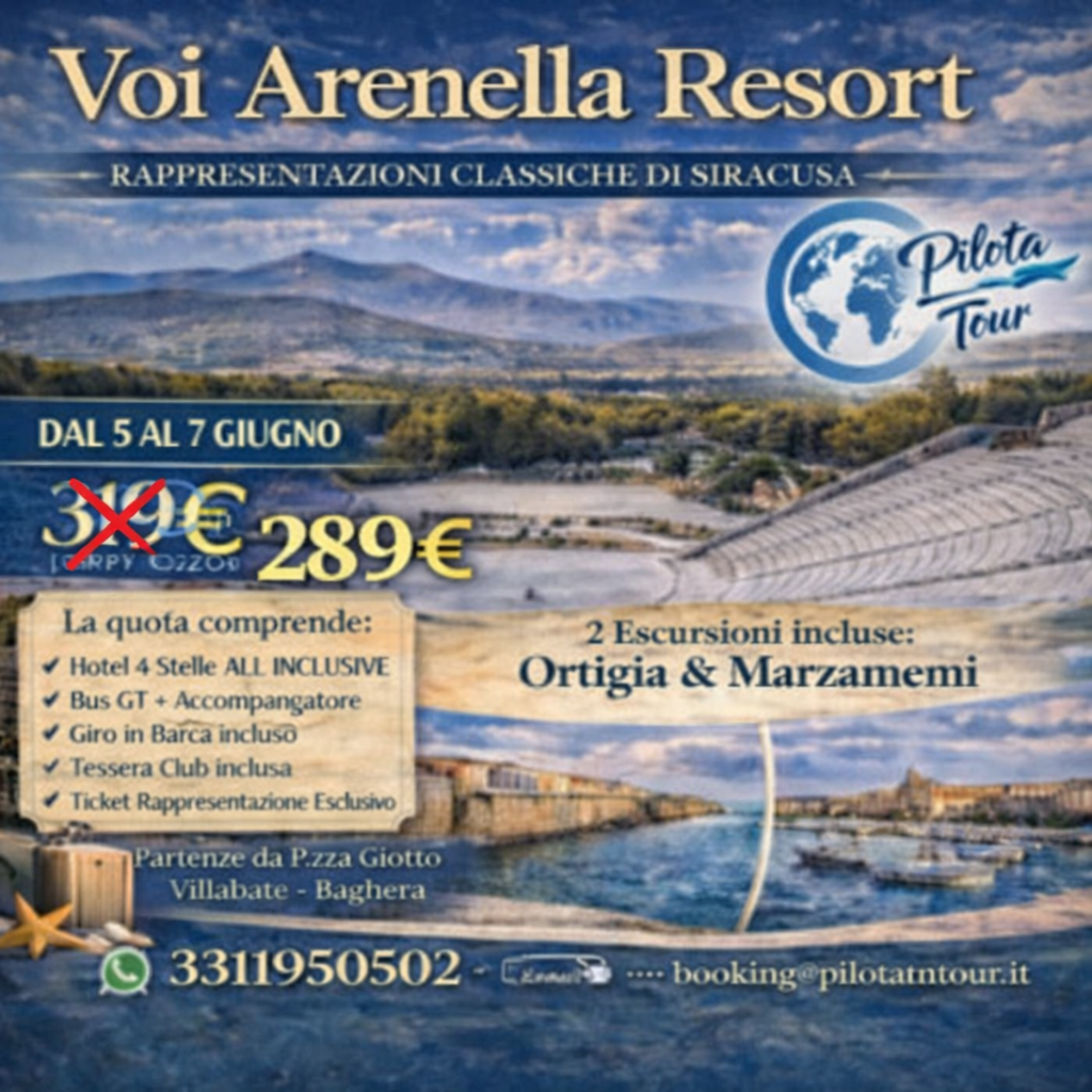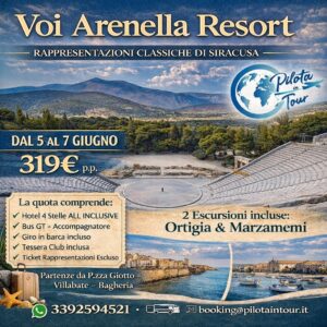 1) Raduno dei partecipanti nei punti di raccolta stabiliti, incontro con un ns coordinatore, sistemazione in Bus GT e partenza per Siracusa. Ore 12.30 arriva all’Hotel VOI Arenella Resort. Pranzo in hotel. Sistemazione nelle camere. Escursione a Ortigia per il giro in barca ( ticket 𝐈𝐧𝐜𝐥𝐮𝐬𝐨 ) comprende la costa nord di Siracusa ovvero le grotte marine dove si entra dentro per ammirare stalattiti, fiori di corallo e acqua cristallina, si prosegue per la grotta a forma di cuore, la roccia a forma di delfino, il monumento ai caduti della seconda guerra mondiale, passaggio sotto il ponte umbertino. Dopo l’escursione direzione presso il parco archeologico per assistere alle rappresentazioni classiche di ANTIGONE. Al termine dello spettacolo passeggiata e cena libera a Ortigia. Rientro in Hotel e Pernottamento.